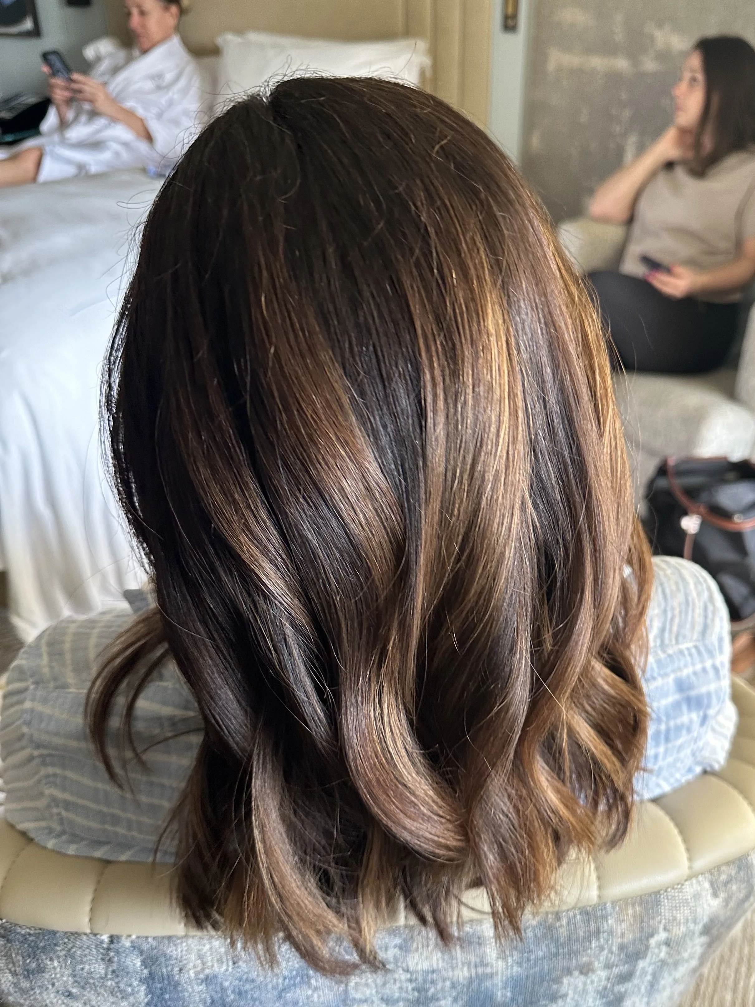 Blowout on shoulder length hair with volume and soft waves in Newport Beach #ocbridalhairmu